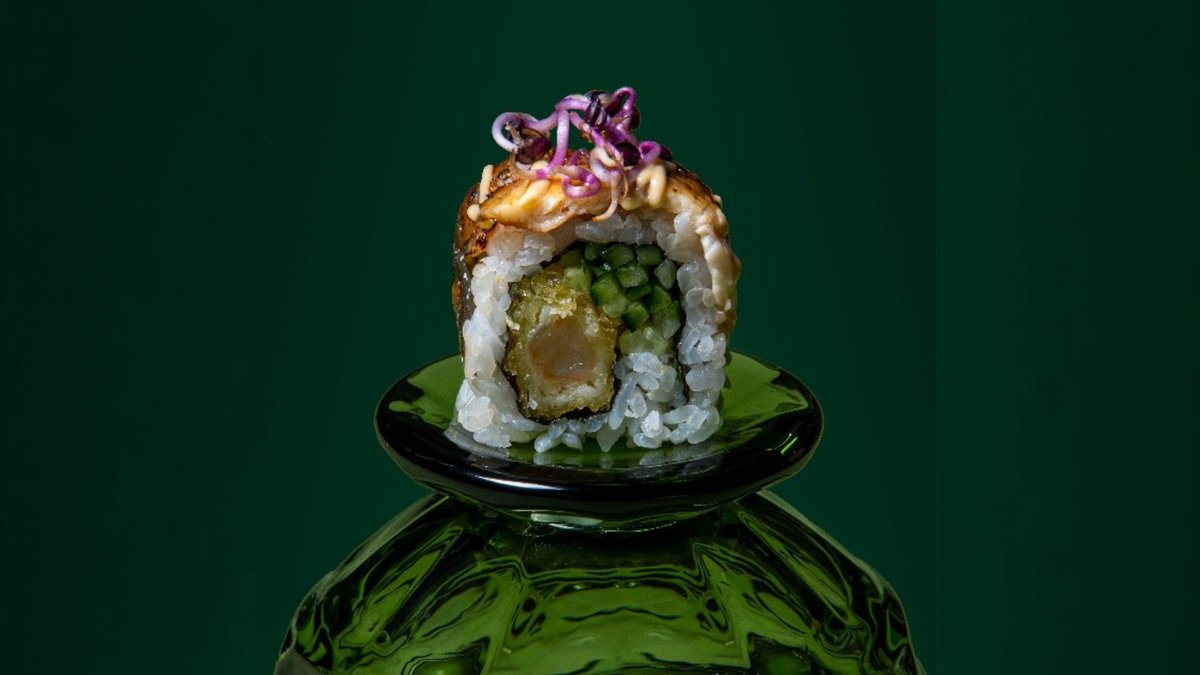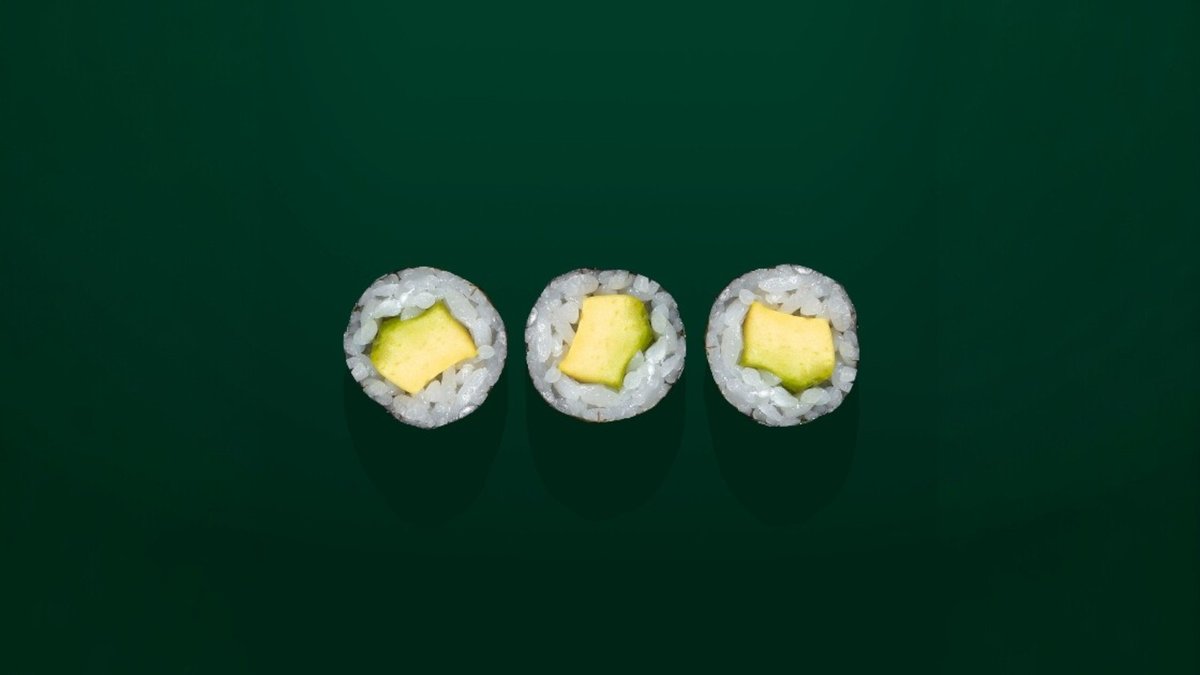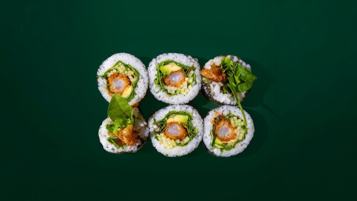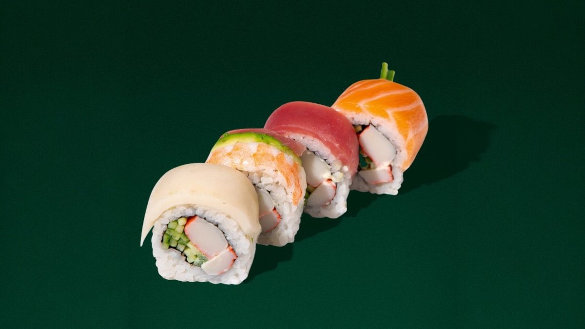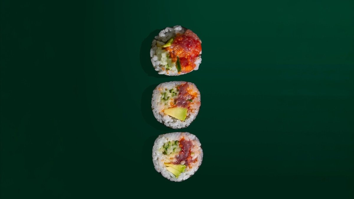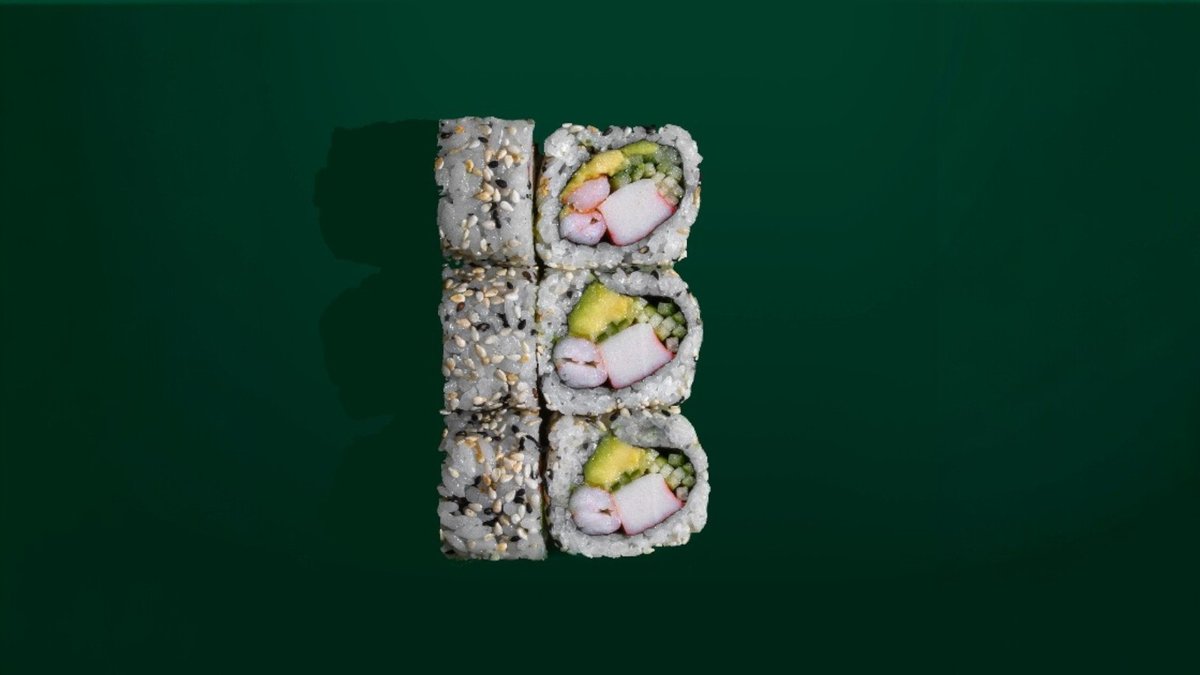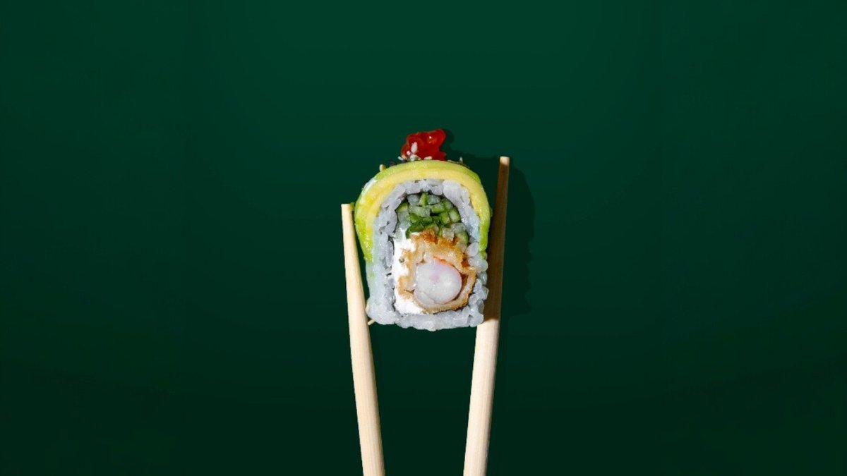 Agurkas, avokadas, marinuotas ridikas, masago ikrai. Viršuje – krevetės, teriyaki mayo padažas, daržovių daigai