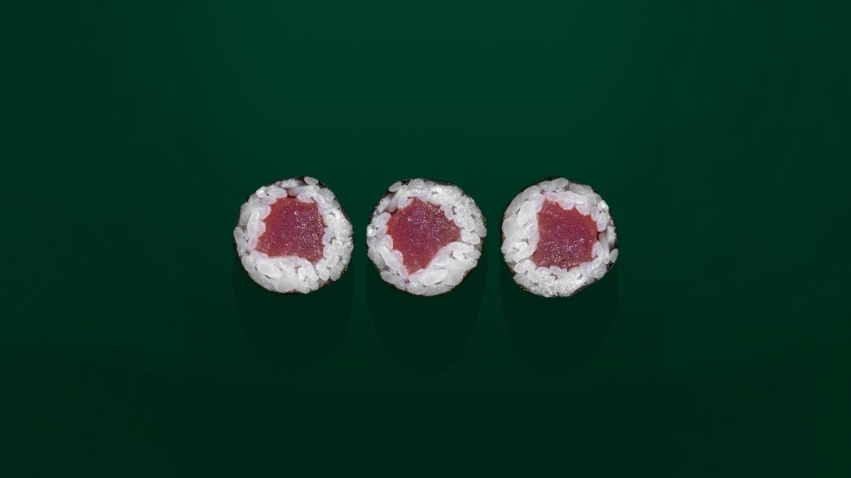 Tunas, masago ikrai, agurkas, aštrus padažas, laiškiniai česnakai