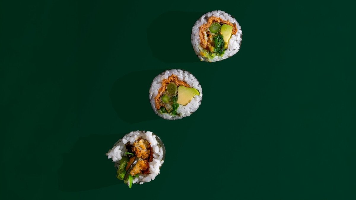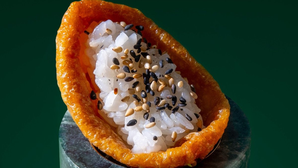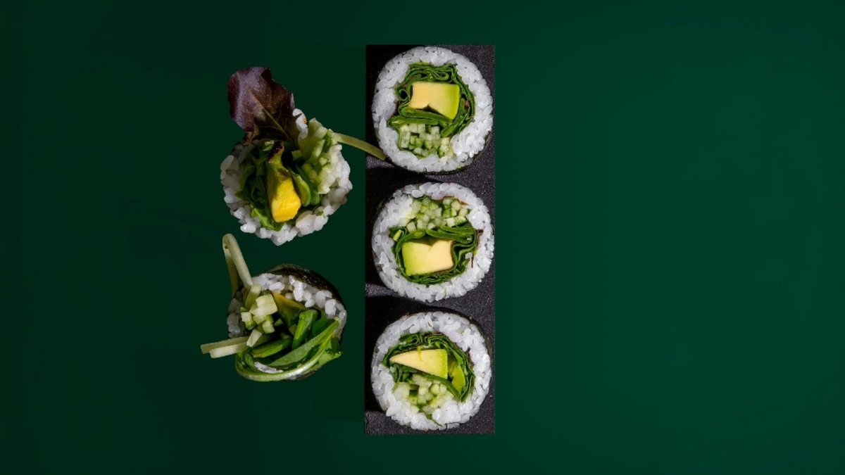 Sušių ryžiai su goma padažu, tofu, sojų pupelės, marinuoti enoki grybai, avokadas, tempuroje kepti šparagai, lotoso šaknies traškučiai, porų daigai.