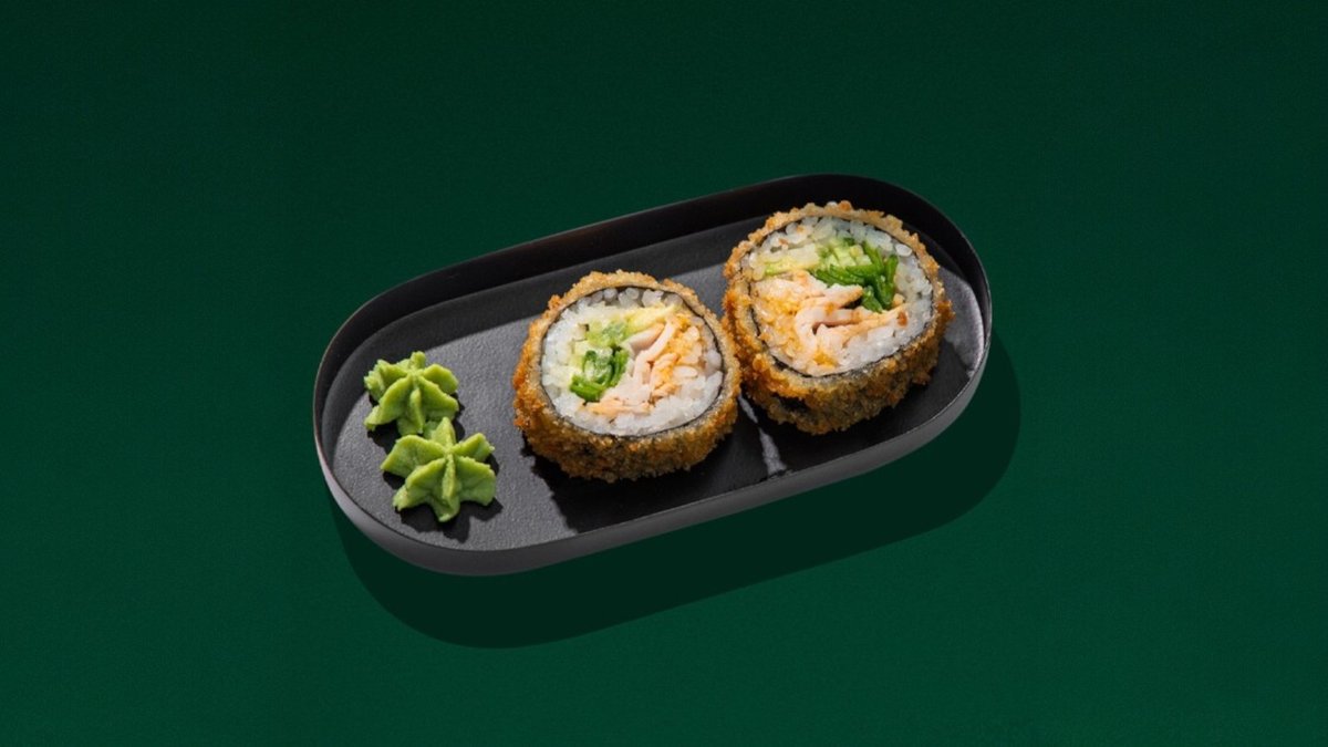 Ryžių lakštas, keptos krevetės tempuroje, salotų mišinys, agurkas, avokadas, masago ikrai. Pateikiamas su goma padažu.