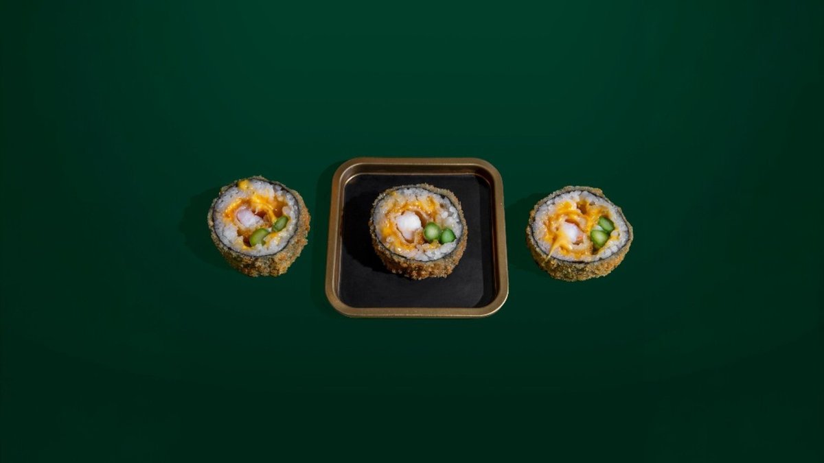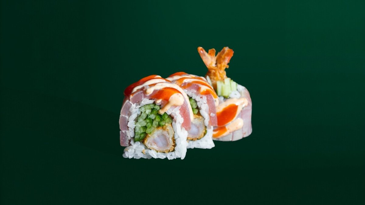 Keptos tigrinės krevetės tempuroje, Filadelfijos sūris, agurkas. Viršuje – degintas tunas, aštrus padažas.