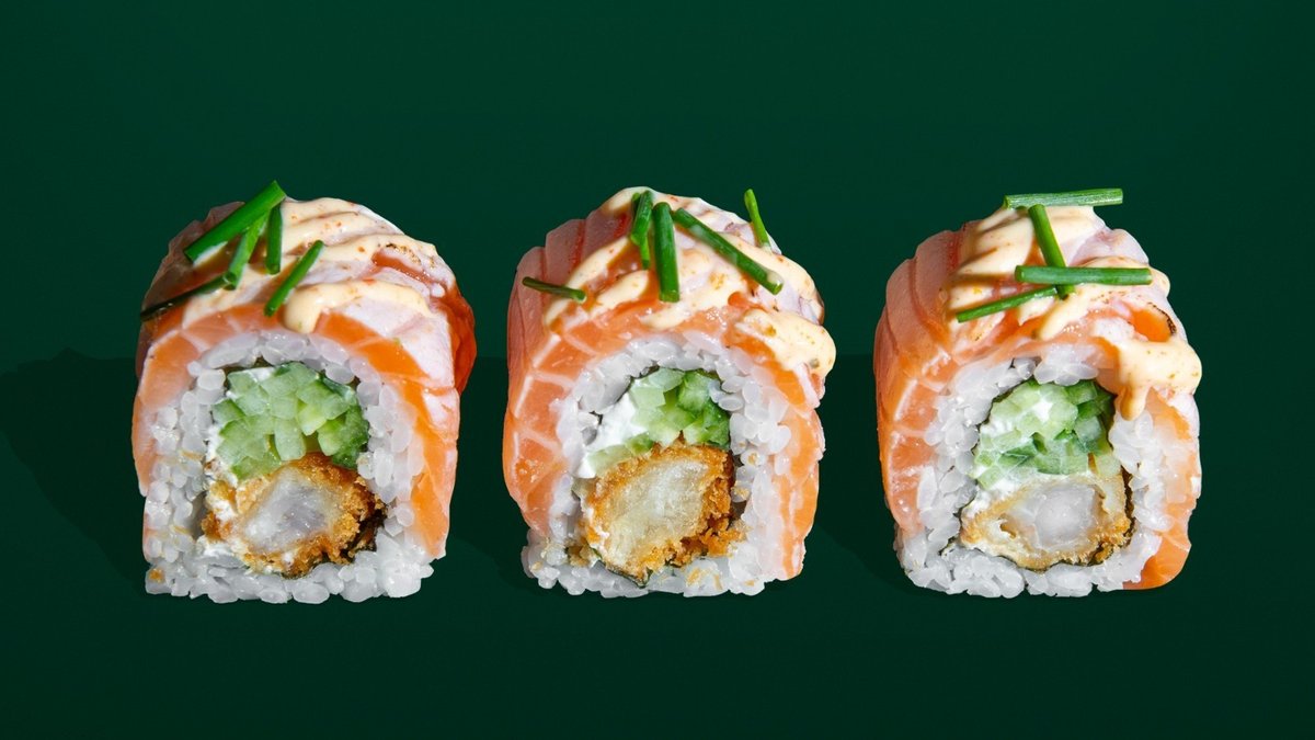 Keptos tigrinės krevetės tempuroje, Filadelfijos sūris, agurkas. Viršuje – deginta lašiša, aštrus padažas ir laiškiniai česnakai