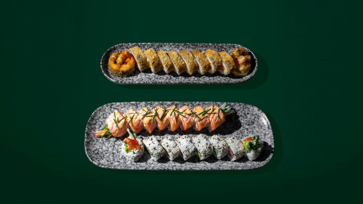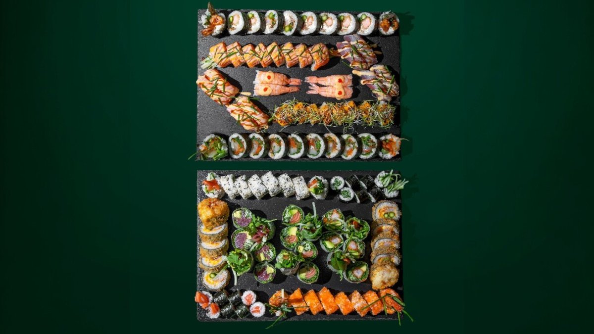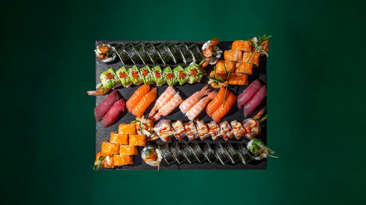 Kani ebi maki, ebiten masago maki, ebiten futo, tekka futo, vulcano tempura, dragon, flamed sake maki, sake hoso maki, tekka hoso maki, 4x flamed sake nigiri, 4x flamed maguro nigiri, 4x spicy ebi nigiri, 6x summer rolls, 6x salmon, 6x tekka, 6x tempura