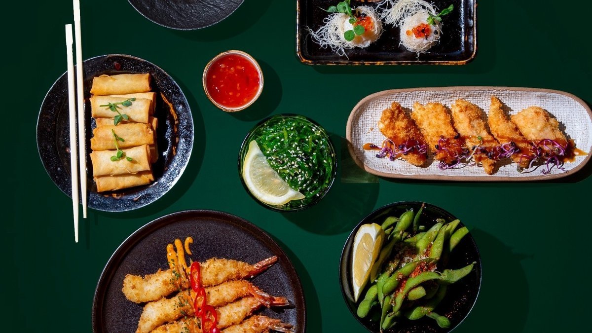 Sušių ryžiai su goma padažu, krevetės tempuroje, sojoje marinuoti svogūnai, agurkai, Wakame, naminis sweetchili padažas, čili pipirai.