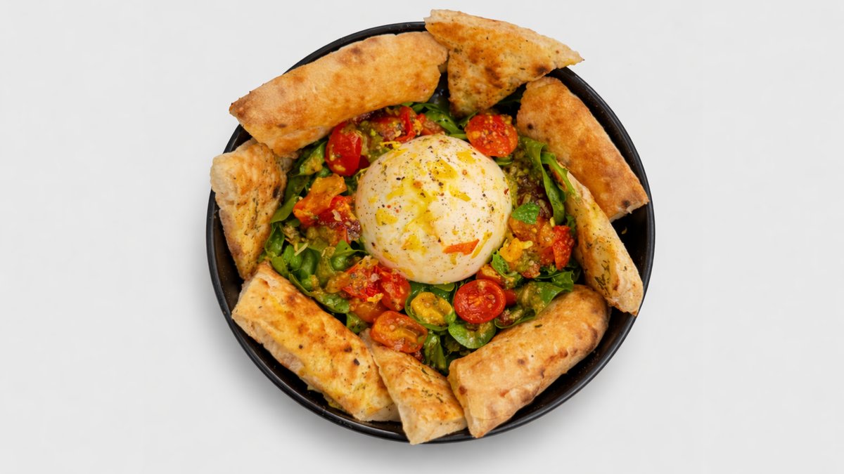 Pomidorų padažas, fior di latte mozzarella, pomidoriukai, stracciatella, alyvuogės