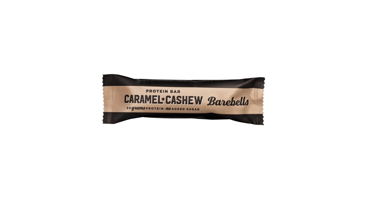 Karamelės skonio baltyminis batonėlis glaistytas pieniniu šokoladu su anakardžių riešutais su saldikliais BAREBELLS, 55 g