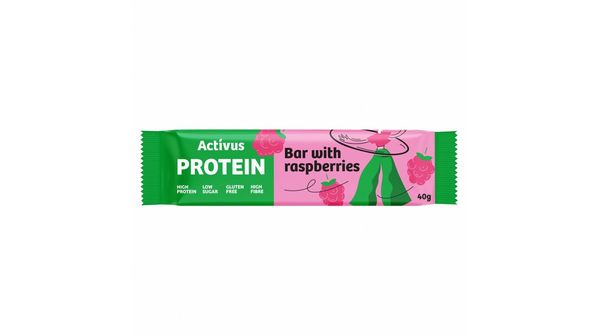 Baltyminis batonėlis su avietėmis, glaistytas šokoladu su saldikliais ACTIVUS, 40 g