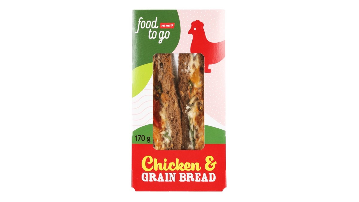 Duonos su grūdais sumuštinis RIMI, su saldžiai aštria vištiena, kepta paprika ir špinatais, 170 g