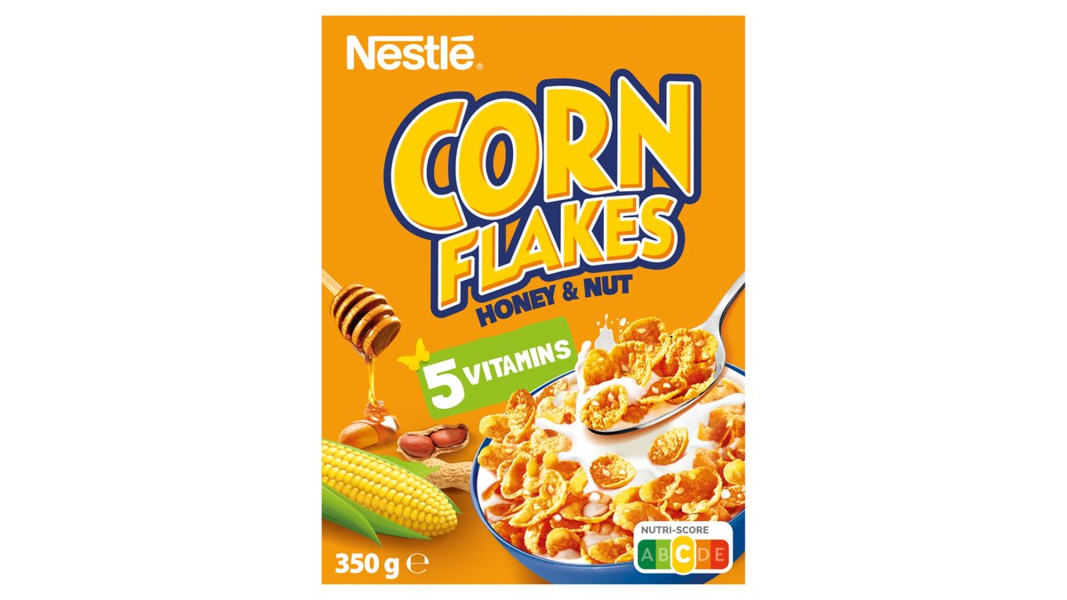 Kukurūzų pusryčių dribsniai su medumi, žemės riešutais ir vitaminais NESTLE HONEY & NUT, be glitimo, 350 g