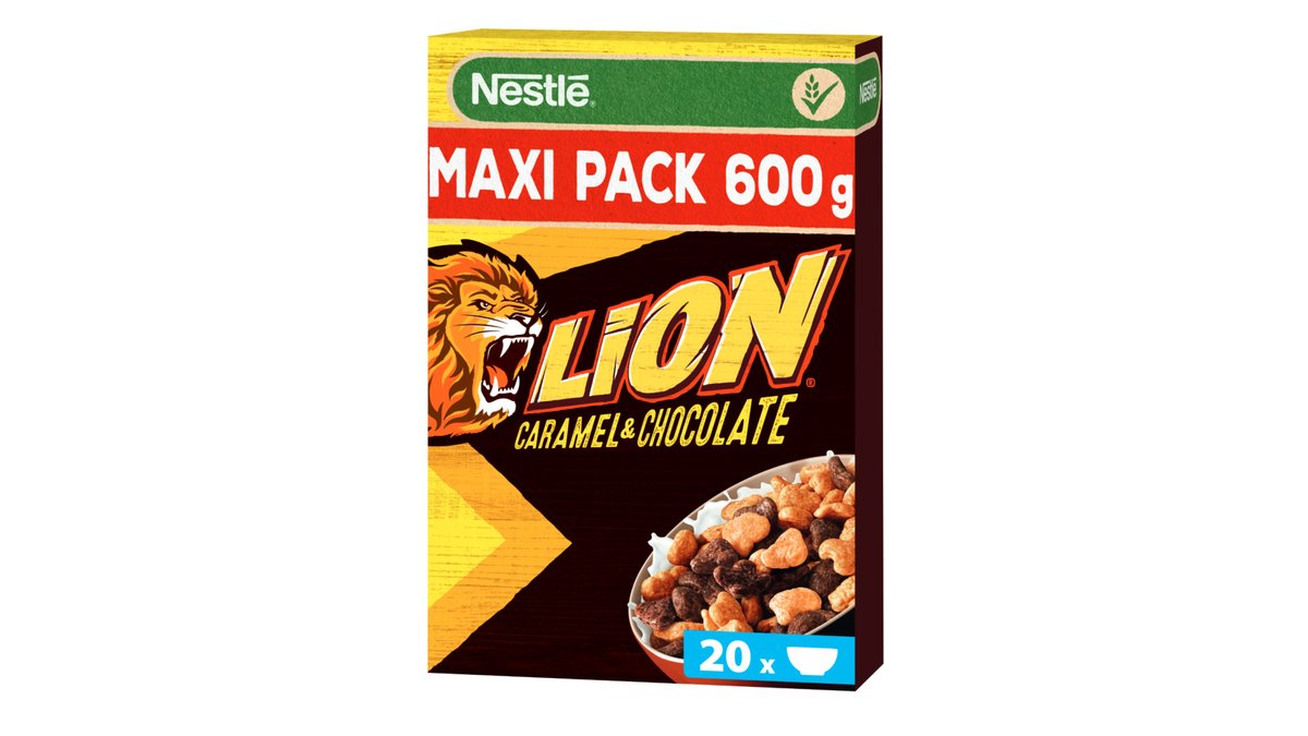 Pusryčių dribsniai su šokoladu, karamelės pasta, vitaminais ir mineralinėmis medžiagomis LION, 600 g