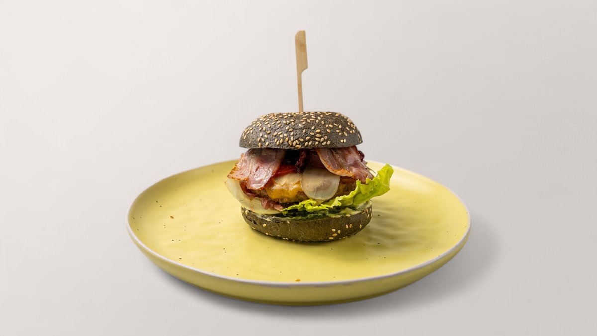 Melna cepta maizīte, liellopu kotlete, bekons, karamelizēti sīpoli, ķiršu mērce, aizberga salāti, tomāti, marinēti gurķi, siers "Cheddar"