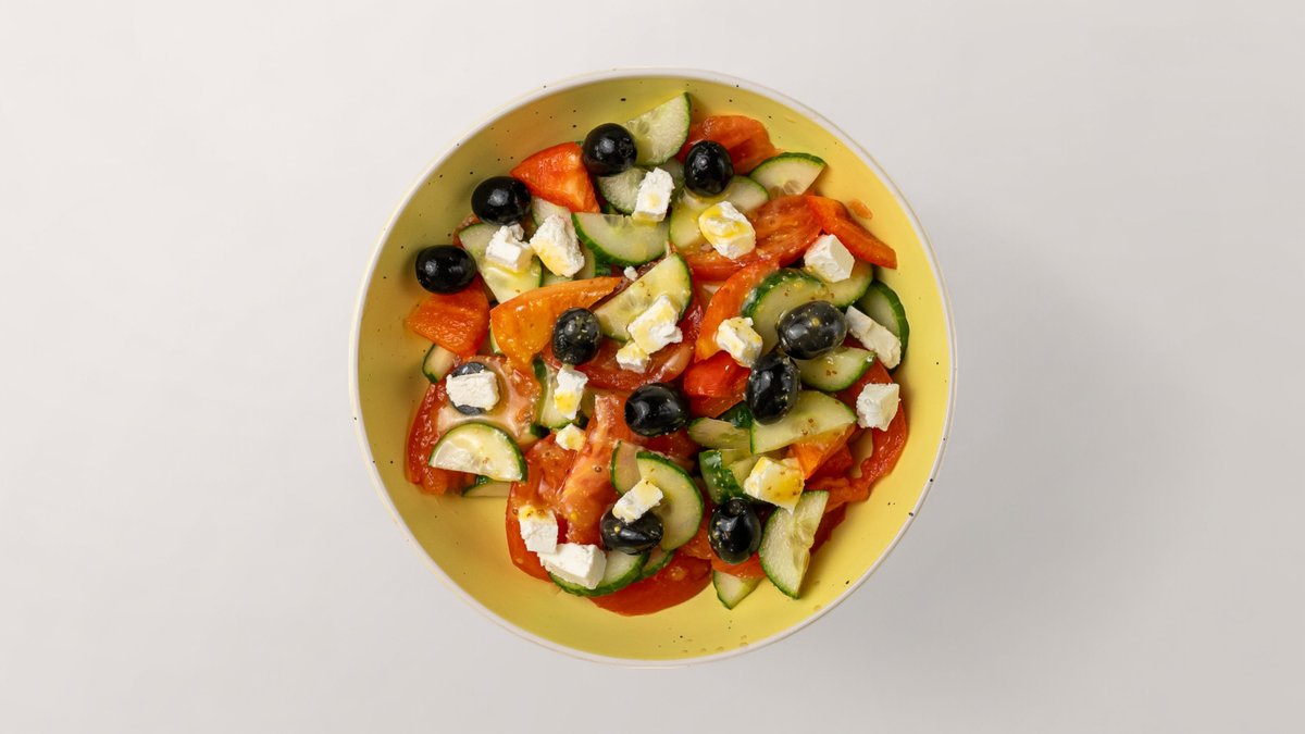 Tomāti, gurķi, paprika, sarkanie sīpoli, olivu, siers un mērce