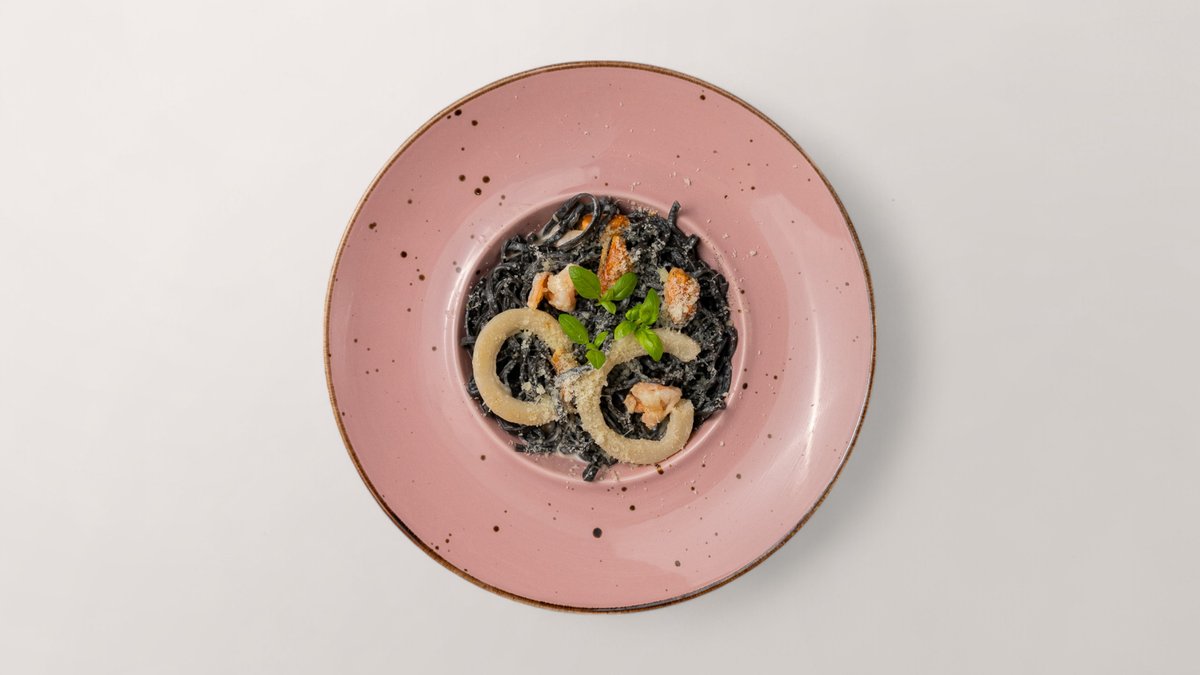 Melnie spagetti, mīdijas, gārneles, kalmārs, sīpoli, krējuma mērce, "Parmezāns"