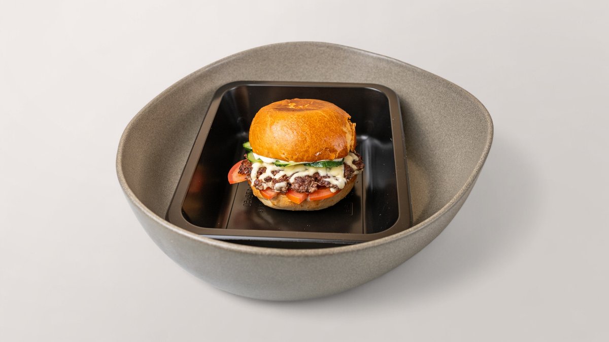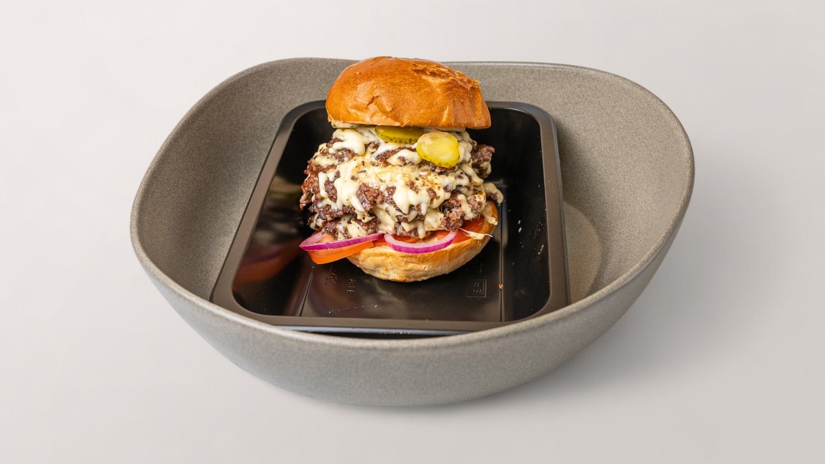 Smashburgers ar izcilas kvalitātes svaigu liellopa gaļu, klasisko burgeru mērci, mārinetiem sarkaniem sīpoliem, mārinētiem gurķīšiem un svaigiem tomātiem