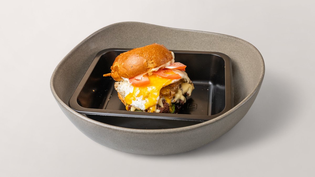 Smashburgers ar izcilas kvalitātes liellopa gaļu, bekonu, olu, tomātiem un burgeru mērci