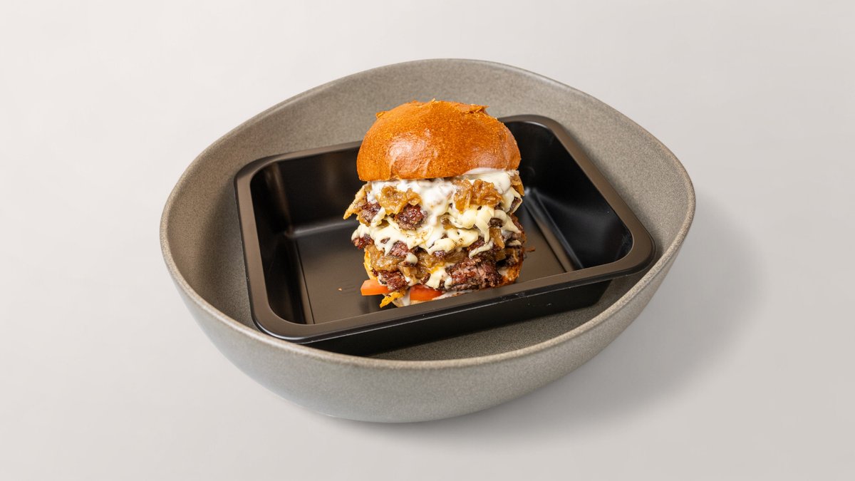 Smashburgers ar izcilas kvalitātes svaigu liellopa gaļu, zilā siera mērci, karamelizētiem sīpoliem, un svaigiem tomātiem