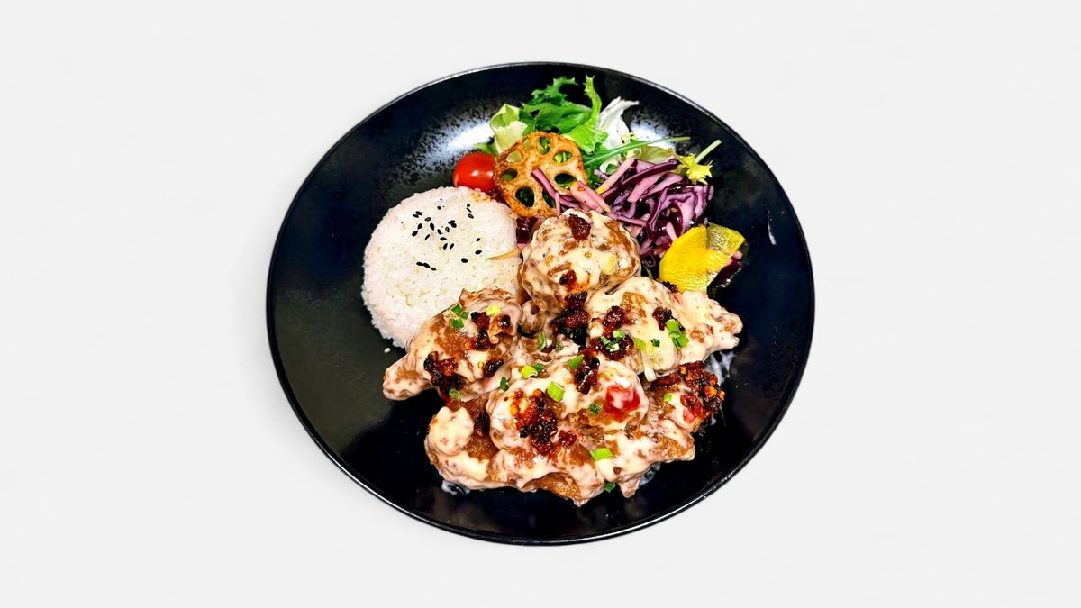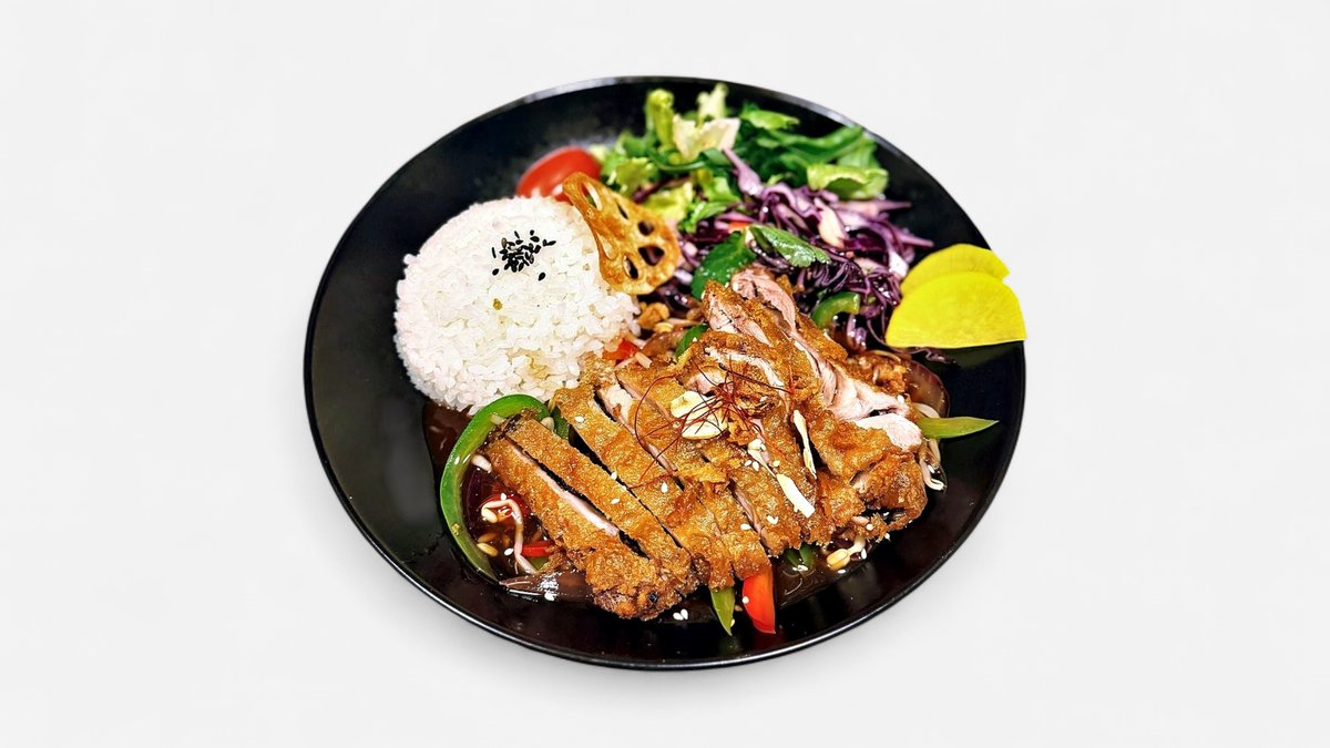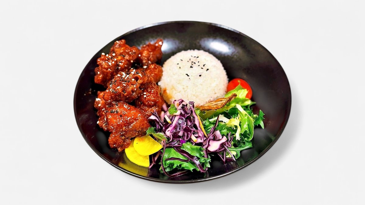 Vistas gaļa, goshujang (korejiešu čili), sojas mērce, tomāts, ķiploks, rīsi, dārzeņi, sezāms