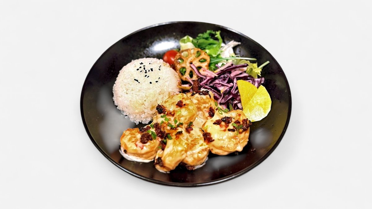 Garneles, čili, majonēze, laims, lociņi, rīsi, dārzeņi