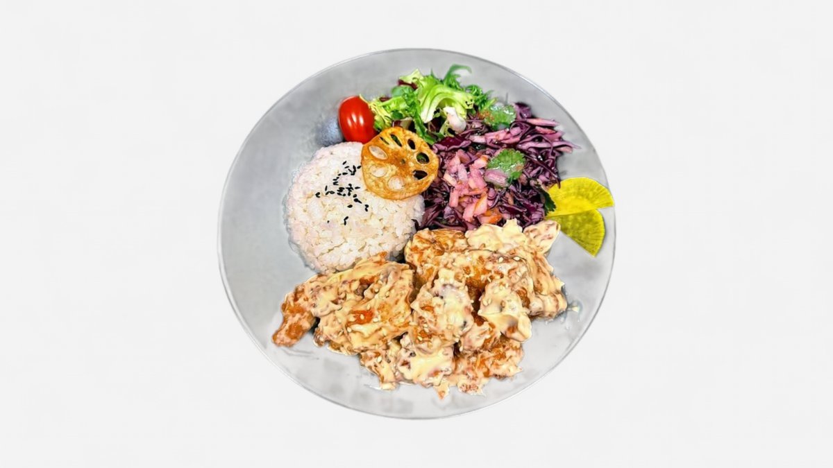 Sojas proteīns, gochujang (korejiešu čili), sojas mērce, tomāts, ķiplogs, sezams, rīsi, dārzeņi