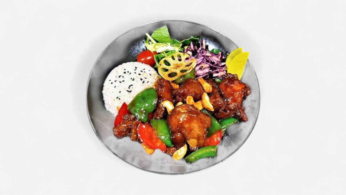 Vistas gaļa, Indijas rieksti, salda paprika, sojas mērce, sezams, rīsi, darzeņi