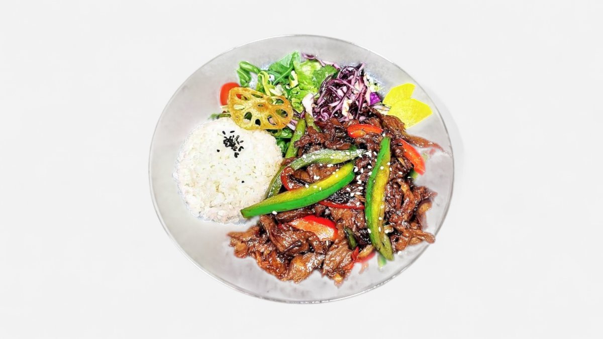 Liellopu gaļa, salda paprika, ķiploks, sīpoli, sojas mērce, sezams, rīsi, dārzeņi