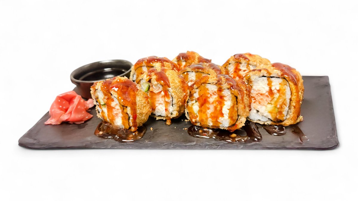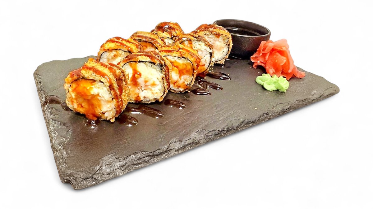 Nori lapa, rīsi, krēmsiers, kūpināts zutis, lasis, avokado, siera maisījums, unagi mērce Silti pirmās 3 minūtes