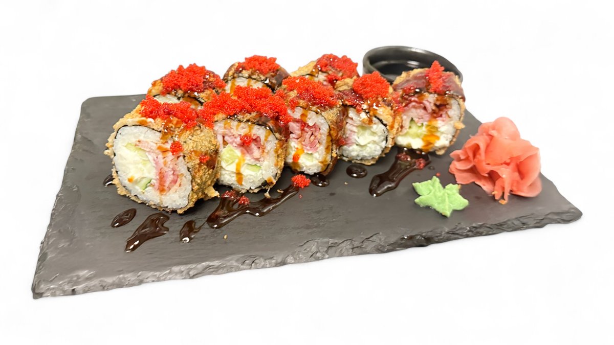 SURIMI MIX , GREEN AVOKADO , SAKE KAPPA CHEESE , HOT KUP TAMANEGI , EBI SPICE MAKI