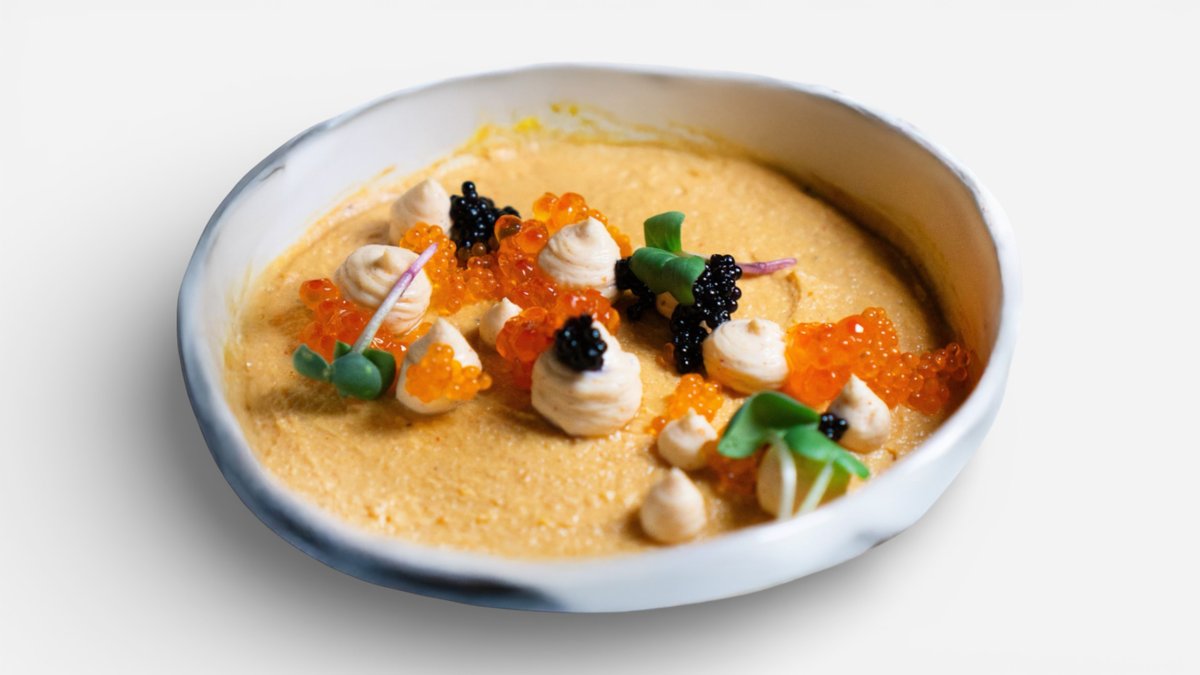 Ar avokado, miso mērci, sarkaniem ikriem, sīpoliem, amarants un olu konfīts