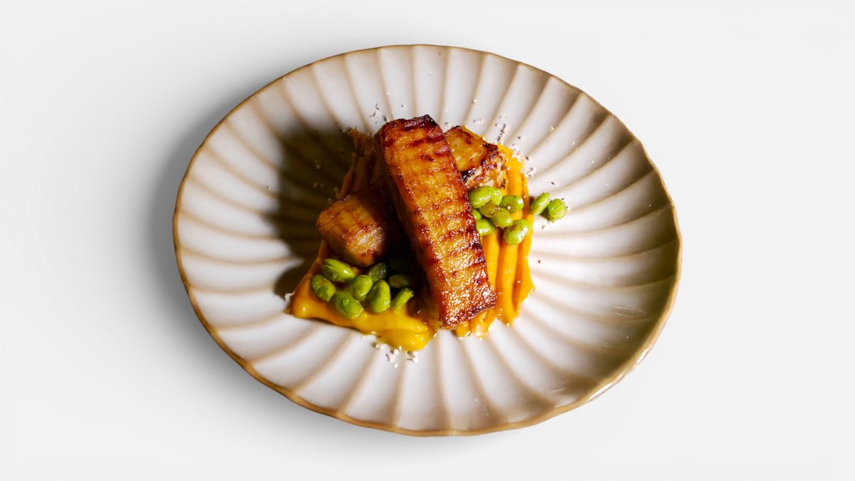 ar saldo kartupeļu biezeni un trīs buljonu mērci, amarants un Edamame pupiņas