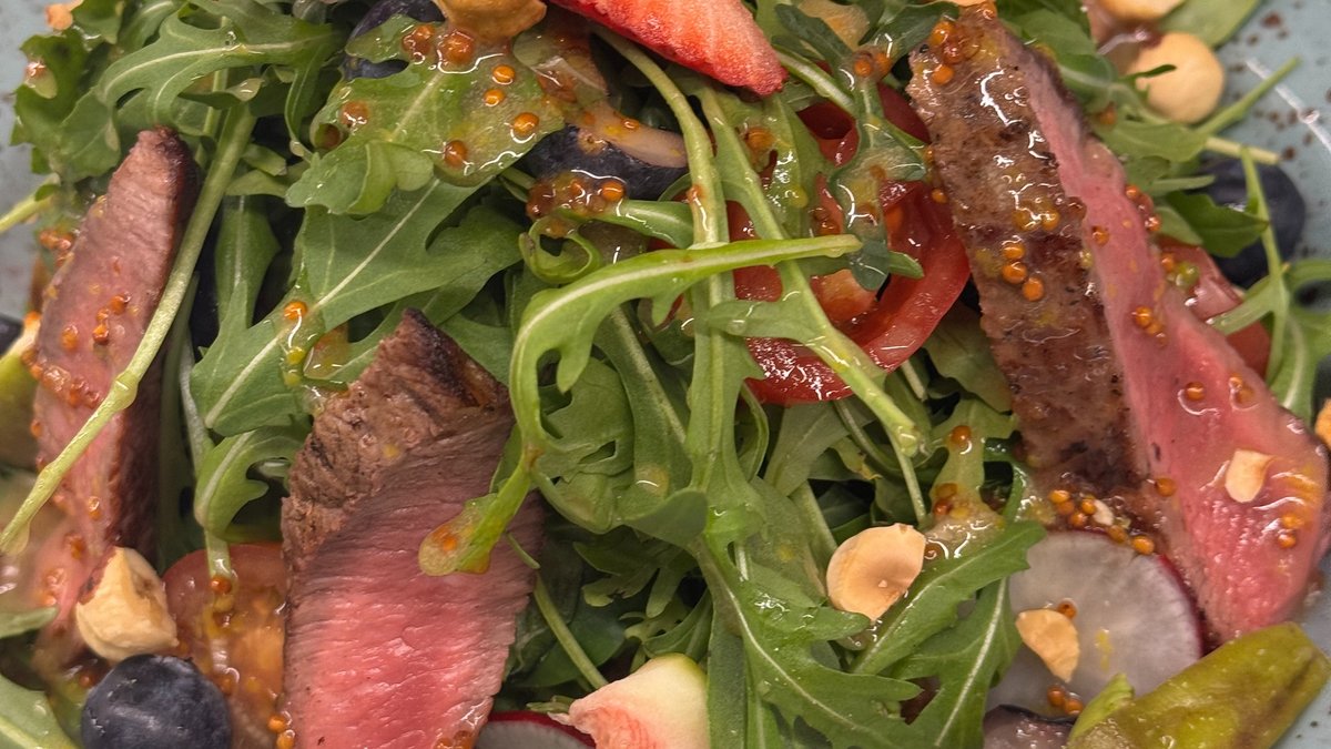 Antrekota salāti ar rukolu,redīsiem,vīģi, lazdu riekstiem un medus-sinepju mērci