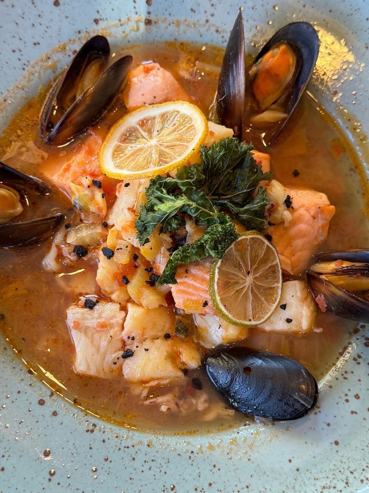 Vidusjūras zivju zupa pasniegta ar ķiploku sviesta bageti
