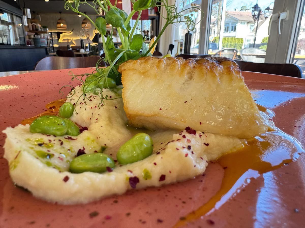 Ātes fileja ar puķkāpostu biezeni, mango mērci un Edamame pupiņām
