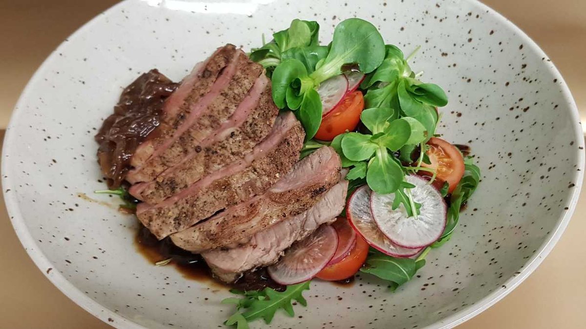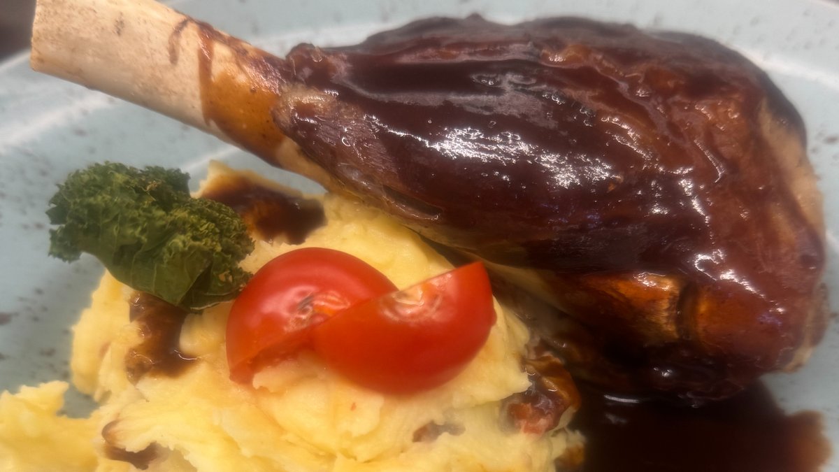 Pasniegta ar kartupeļu biezeni, saulē kaltētiem tomātiem un sarkanvīna-hoisin mērci
