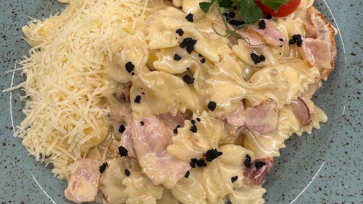Pasta farfalle ar cūkgaļas šķiņķi,parmezāna mērci un saulē kaltētiem tomātiem