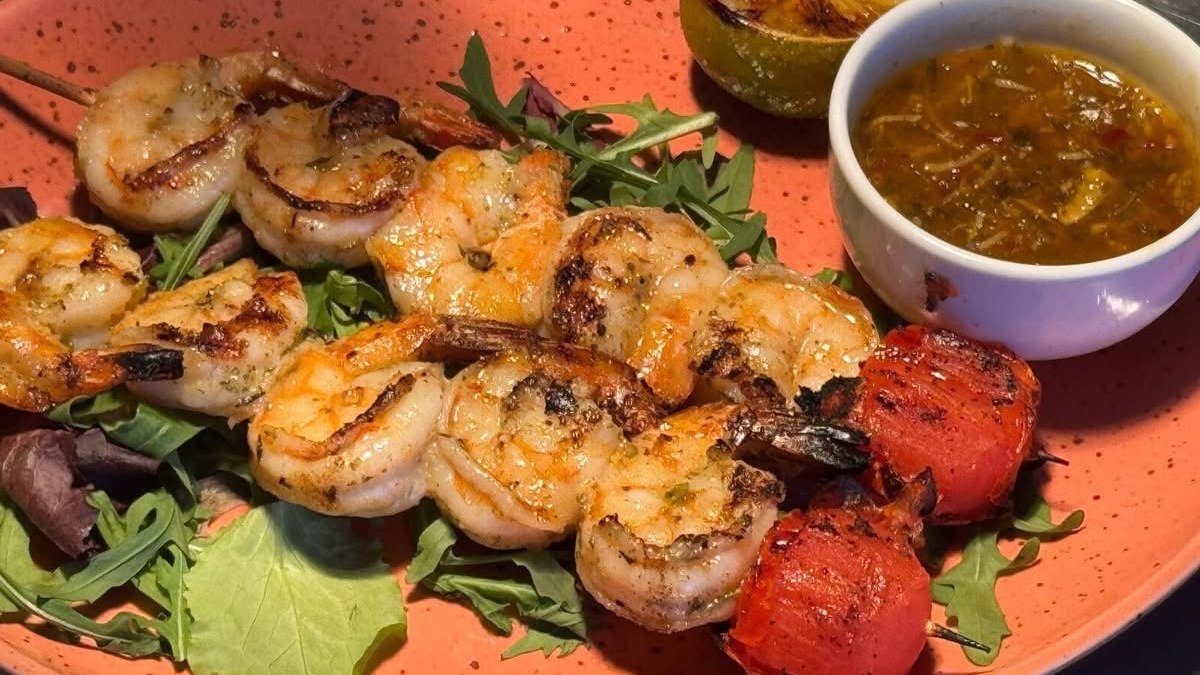 Uz iesmiņa grilētas tīģergarneles (10 gb.) ar saldo čili un pesto, ar salātiem