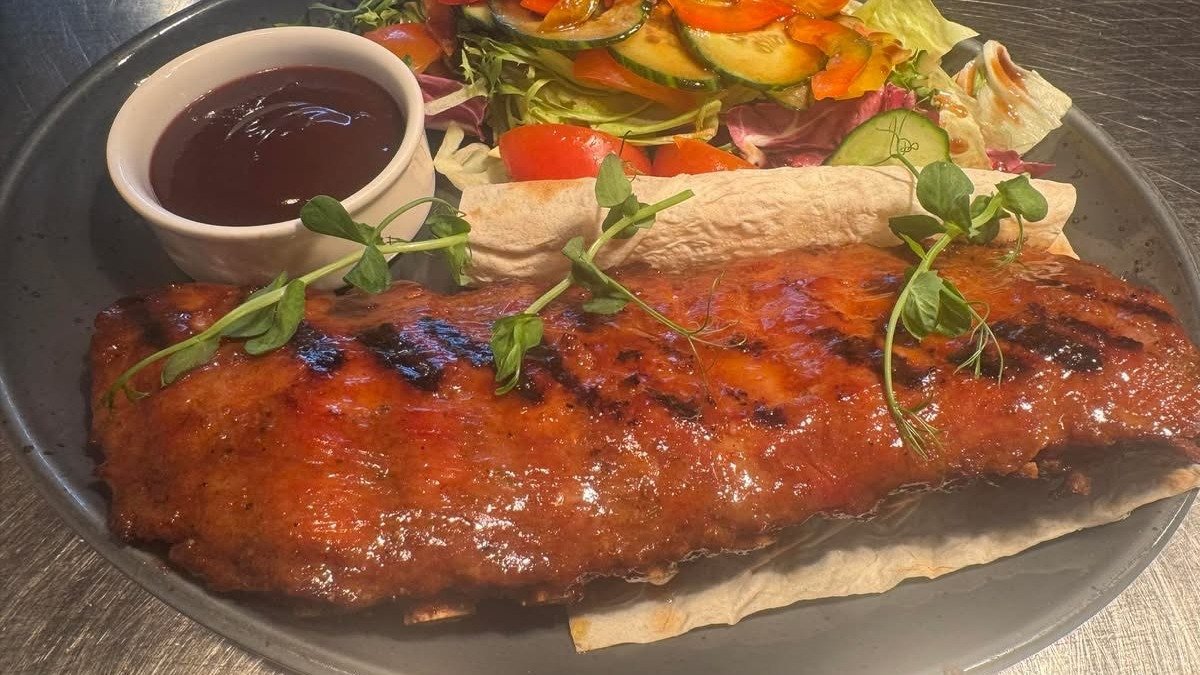 Cūkgaļas ribiņas BBQ 600 gr ar svaigiem dārzeņiem un lavašu