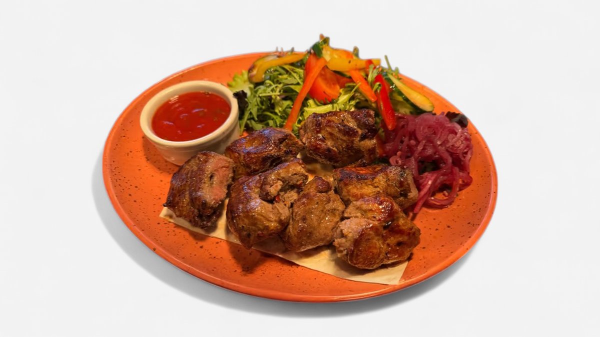 Vistas šķiņķīšu šašliks ar svaigiem dārzeņiem,lavašu un šašliku mērci