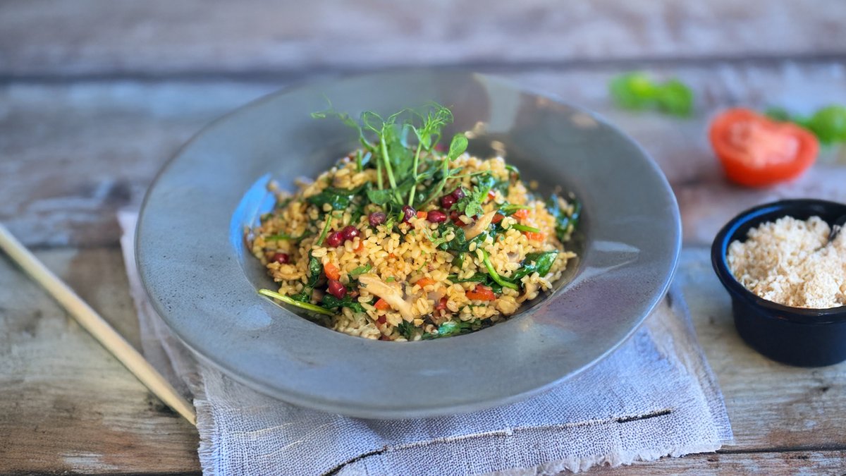 Bulgurs ar šampinjoniem, papriku un spinātiem
