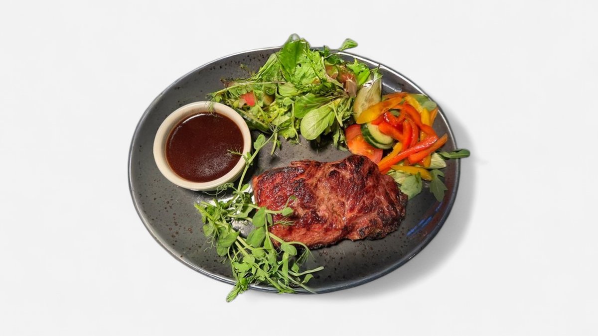 Rib-eye steiks ar svaigiem dārzeņiem un sarkanvīna mērci