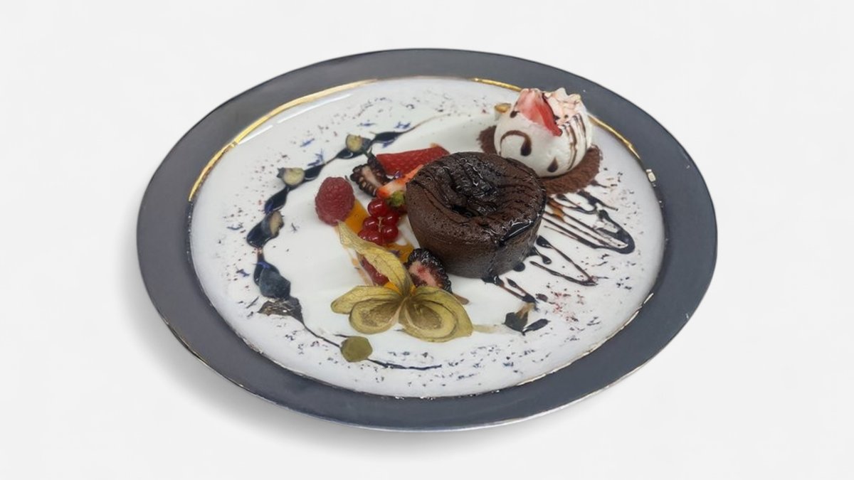 Šokolādes fondants ar vaniļas saldējumu, šokolādes mērci un ogām