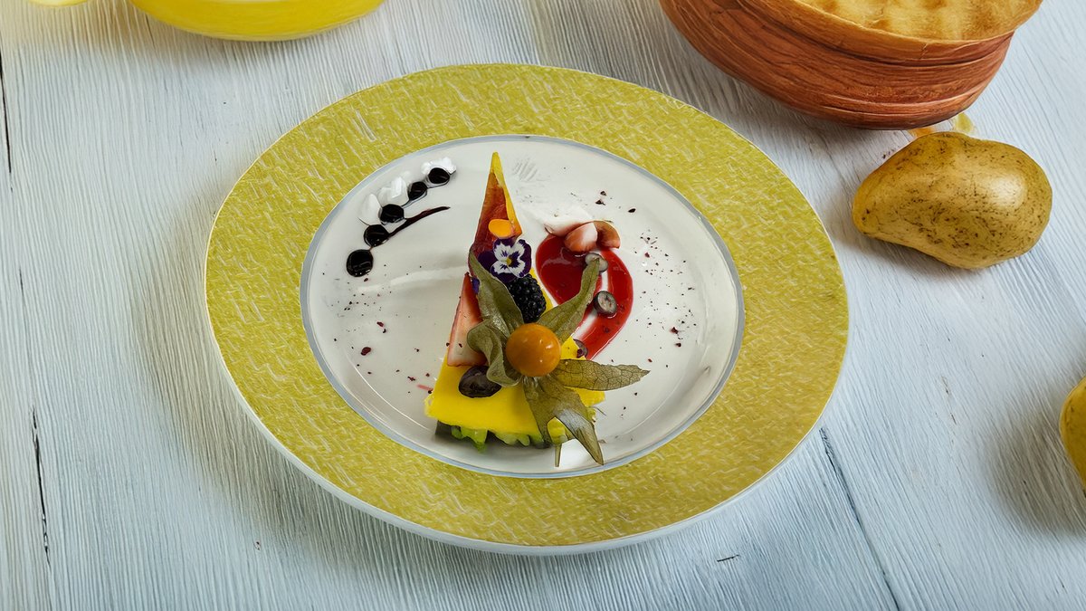 Pasniegta ar ceptiem jaunajiem kartupeļiem, karamelizētiem āboliem un brūkleņu mērci