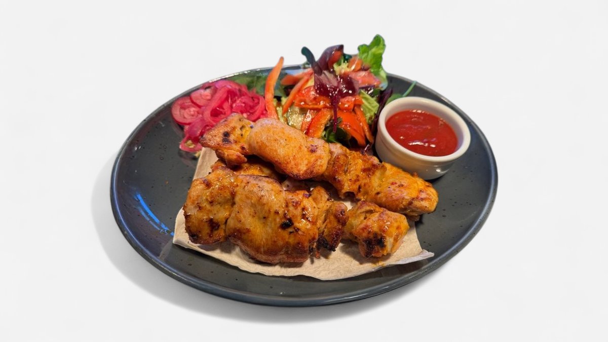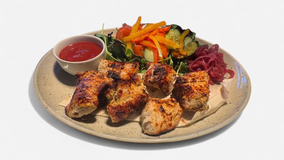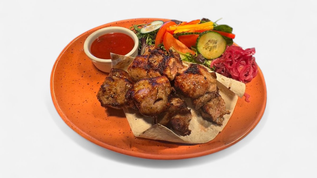 Tītara filejas šašliks ar svaigiem dārzeņiem, lavašu un šašliku mērci