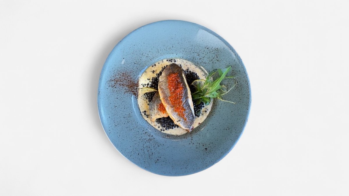 Akmeņasara fileja ar Beluga lēcām, trifeļu mērci un foreļu ikriem