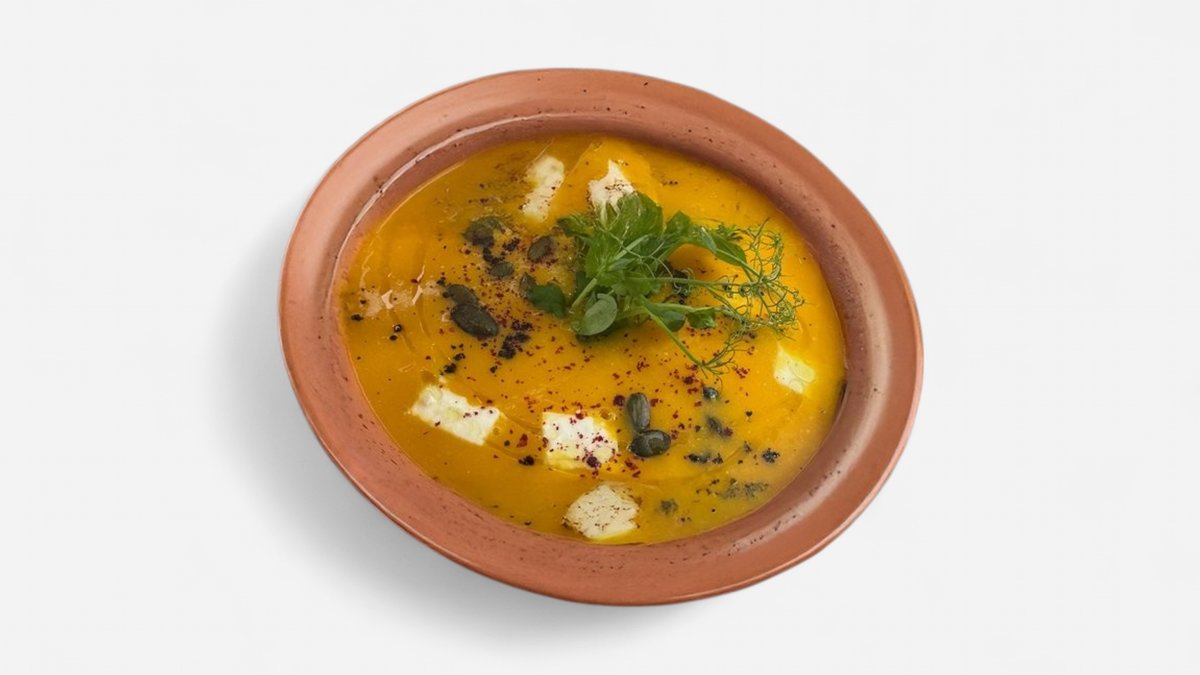 Ķirbju krēmzupa ar Fetas sieru, ķirbju sēklām un ķirbju eļļu