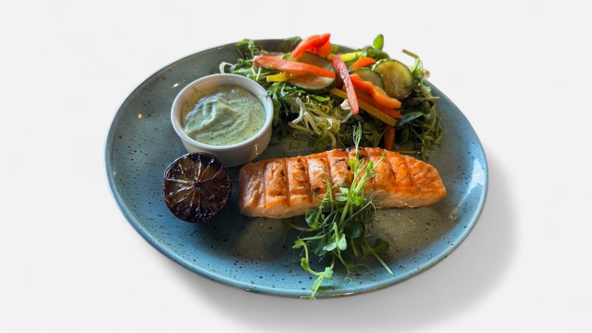 Laša fileja, pasniegta ar svaigiem dārzeņiem un zaļumu-ķiploku mērci