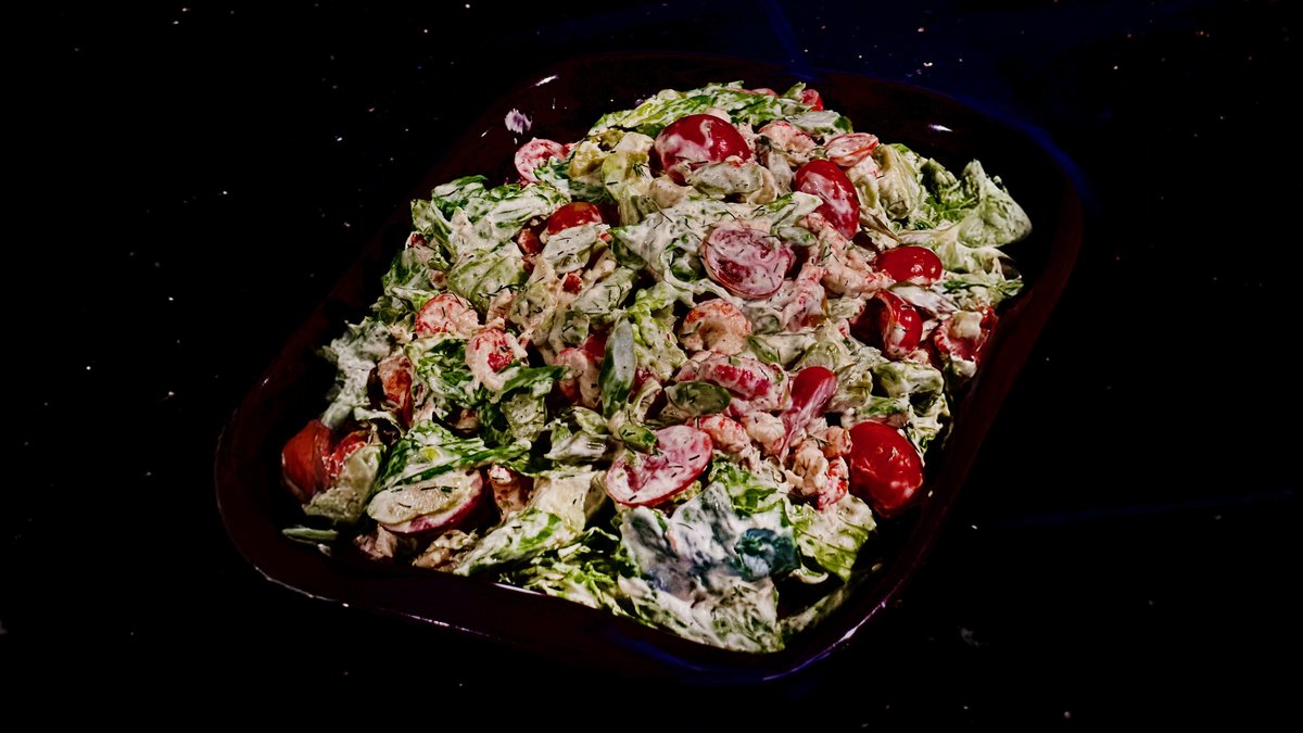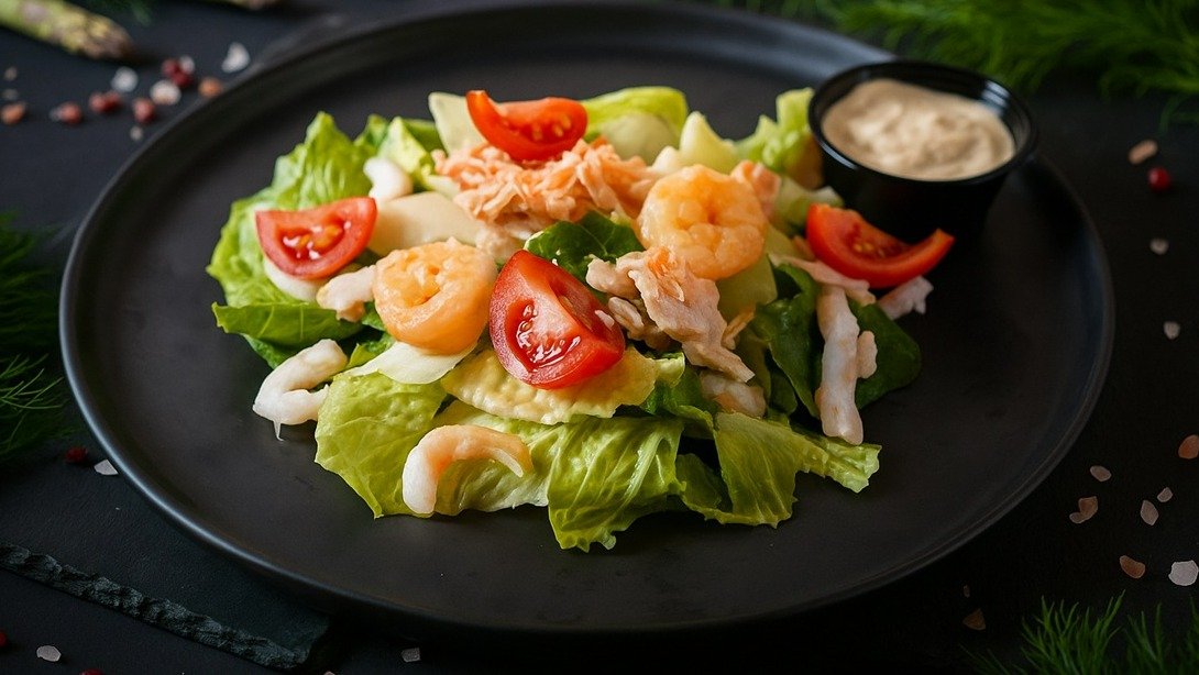 Salāti "Cēzara" ar lasi un garnelēm, 230g