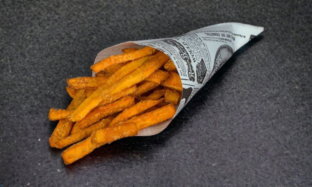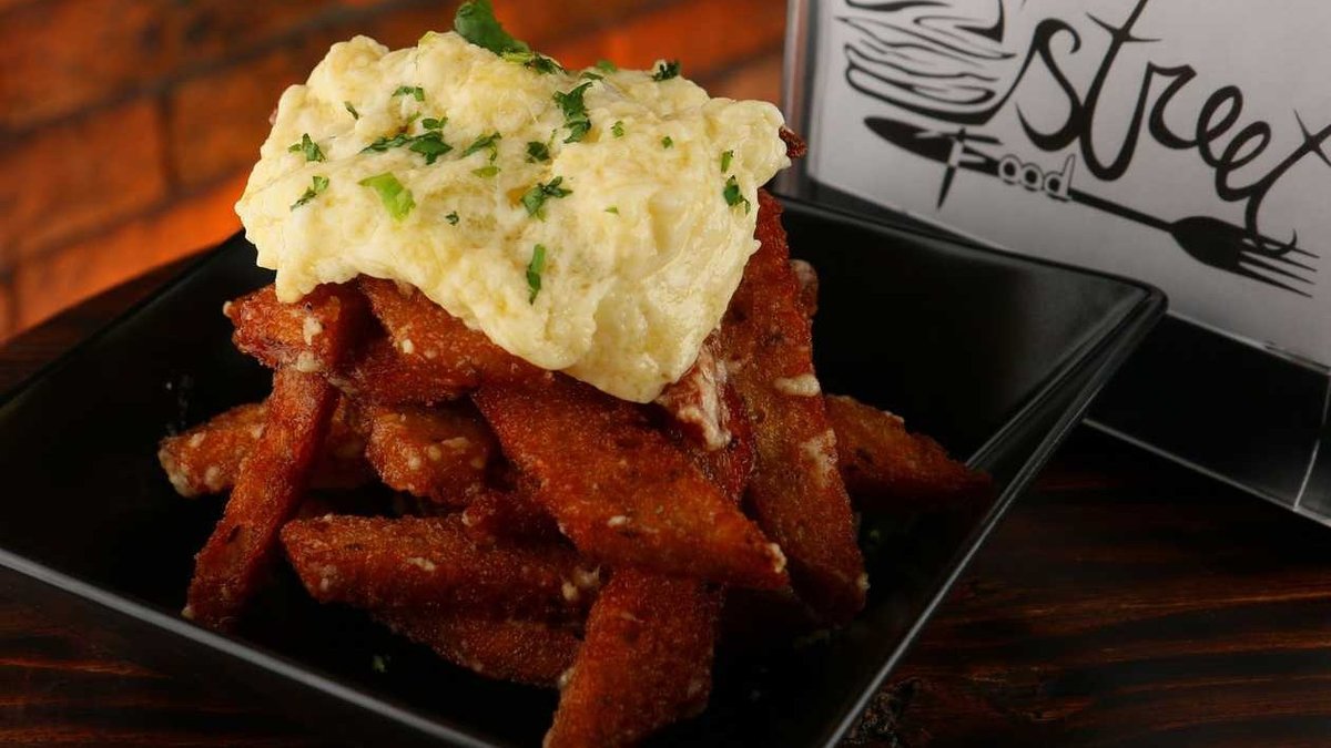 Kartupeļu frī, bekons, Čedaras mērce, ķiršu tomāti, cepti sīpoli, jalapeno, BBQ mērce