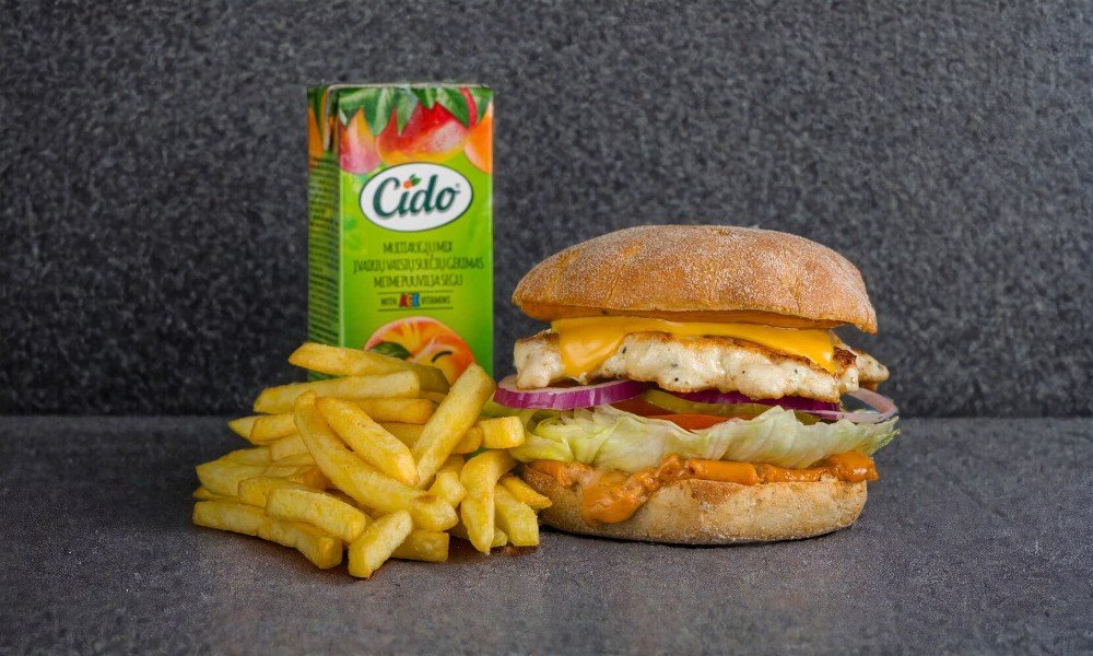 Mazs burgers, liellopa gaļa, frī kartupeļi, salātu lapas, tomāts, marinēti gurķi, sīpols, maiga steiku mērce, dzēriens