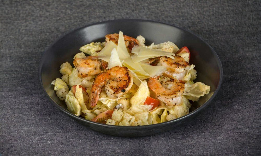 Salātu lapas, ķiršu tomāti, cēzara mērce, anšovi, cietais siers, grauzdēta maize, tīģergarneles