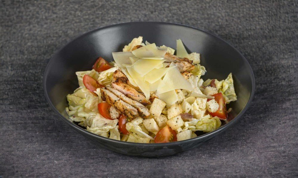 Salātu lapas, ķiršu tomāti, cēzara mērce, anšovi, cietais siers, grauzdiņi, vistas fileja